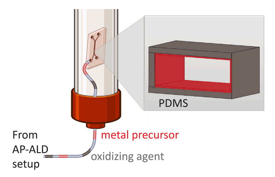 图1.通过使金属前体和氧化剂交替流过微流体芯片的通道,在微流体通道内部原子层沉积金属氧化物纳米层,对键合PDMS微流体芯片进行通道内涂层的图示。出于安全起见,微流控芯片被放置在自制大气压原子层沉积(AP-ALD)装置的管状玻璃柱中。本研究中沉积的两种金属氧化物是二氧化硅(SiOx)和二氧化钛(TiOx),它们支持使用有机溶剂并使通道壁功能化。