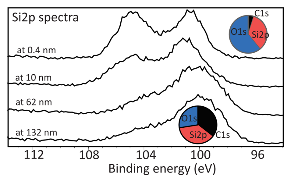 图3.使用XPS研究了在50°C下经20次ALD循环处理的平面PDMS层的表面化学成分,显示了在不同蚀刻深度获得的XPS Si2p光谱。上图显示了蚀刻深度<1nm时的Si2p光谱,顶部插图显示了相应的原子组成。下图显示了蚀刻深度>100nm时的Si2p光谱,底部插图显示了相应的原子组成。