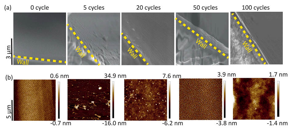 图2.(a)对芯片进行横截面切割后获得的裸和SiOx涂层PDMS芯片的FE-SEM图像,微通道长11.6mm、宽500μm、高50μm。SiOx AP-ALD处理:在50℃下进行5、20、50和100次ALD循环。(b)平面PDMS层上的AFM表面轮廓,与(a)中相应图像进行相同的处理。