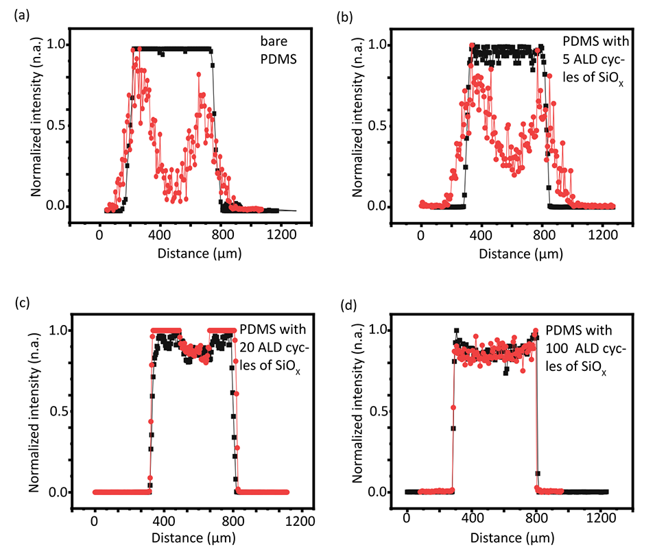 图4.500μm宽通道上的荧光强度,平均高度为50μm,显示了裸PDMS芯片(a)以及经5(b)、20(c)和100(d)个ALD循环处理的PDMS芯片的横截面形状的变形。深灰色线显示1μM罗丹明B在水中的强度分布,而红线显示1μM罗丹明B在氯仿中的强度分布。为了进行比较,每个强度分布都按其最大强度进行了归一化。