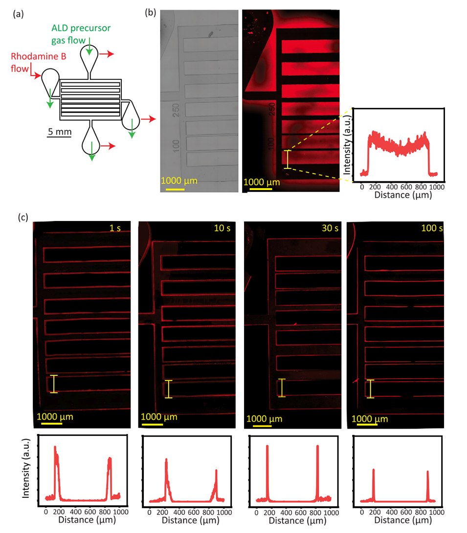 图5.(a)展示了具有不同宽度(100、250和500μm)的微流控通道网络,这些通道垂直于ALD前驱体流动的方向,以可视化这些通道可以被涂覆的程度。绿色箭头表示AP-ALD期间ALD气体前驱体的流动方向,而红色箭头表示壁吸收研究期间罗丹明B溶液的流动。(b)裸PDMS微流控芯片的亮场图像和显示罗丹明B吸收到PDMS壁中的荧光图像。(c)在1秒、10秒、30秒和100秒的不同脉冲曝光时间下,暴露于ALD前体的PDMS微流体芯片的荧光图像,其强度分布是沿底部相应图像中的黄线测量的。SiOx AP-ALD处理:在50℃下进行20次ALD循环。