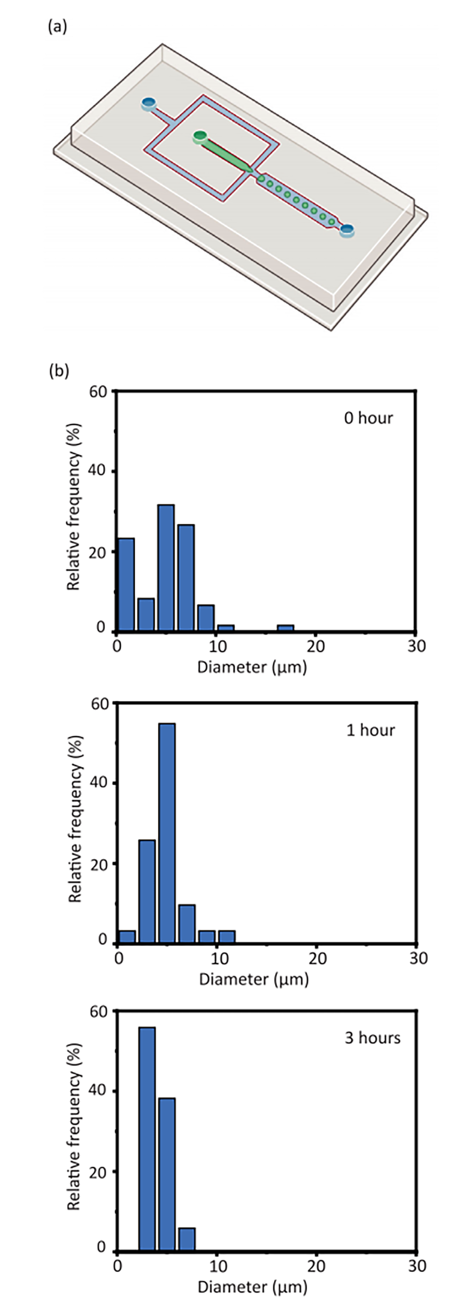 图6.(a)展示了用于连续生产聚乳酸(PLA)微粒的微流控芯片的示意图,该芯片采用了25μm宽的流动聚焦接头,使用氯仿作为PLA的有机溶剂。(b)连续操作0、1和3小时后,芯片外收集的微粒直径分布。分析了至少100个颗粒。