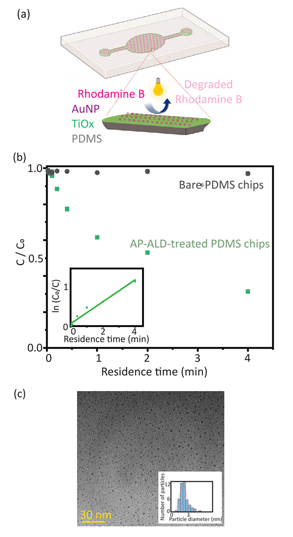 图8.(a)具有一个圆形腔室(10mm宽,50μm高)的微流控芯片的示意图,用于进一步经金纳米粒子功能化的TiOx涂覆的PDMS壁上罗丹明B的光催化降解案例研究。(b)裸芯片和ALD处理芯片出口处罗丹明B的浓度与初始浓度的比较。插图显示了ALD处理芯片在停留时间内的线性拟合。(c)金纳米粒子的TEM图像及其相应的粒径分布。