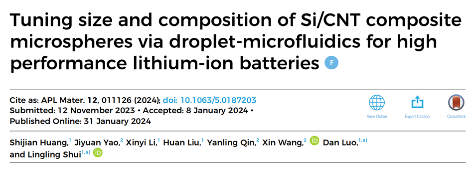 近期,华南师范大学水玲玲教授、罗丹博士等人通过液滴微流控技术制备了尺寸均匀且结构可调的Si/CNT复合微球,研究了其尺寸和成分对电化学性能的影响,为高性能锂离子电池硅基负极材料的设计和商业化提供了新思路。相关研究以“Tuning size and composition of Si/CNT composite microspheres via droplet-microfluidics for high performance lithium-ion batteries”为题目,发表在期刊《APL Materials》上。