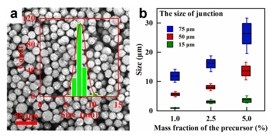 图2.(a)Si/CNT/PS SPs的SEM图像和相应的粒径统计。(b)使用具有不同尺寸接头的微流体装置和不同质量分数的分散相合成的Si/CNT/PS SPs的尺寸分布。