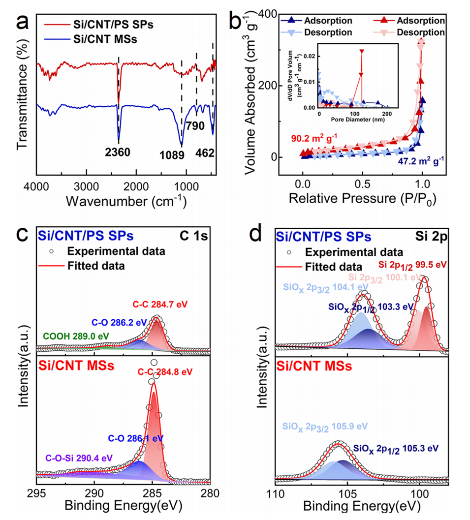 图4.(a)Si/CNT/PS SPs和Si/CNT MSs的FTIR光谱。(b)Si/CNT/PS SPs和Si/CNT MSs的BET表面积图,插图显示了氮气吸附图。(c)Si/CNT/PS SPs和Si/CNT MSs的C1s XPS光谱;以及(d)Si/CNT/PS SPs和Si/CNT MSs的Si2p XPS光谱。