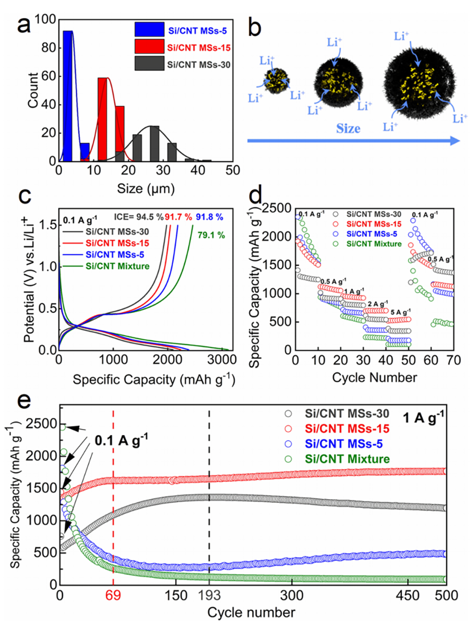 不同尺寸的Si/CNT复合微球(如5μm、15μm和30μm)在电化学性能上表现出显著差异。较小的微球(Si/CNT MSs-5)在充放电过程中容易破坏,导致较差的循环稳定性,而较大的微球(Si/CNT MSs-30)则表现出较长的激活时间和较低的容量。