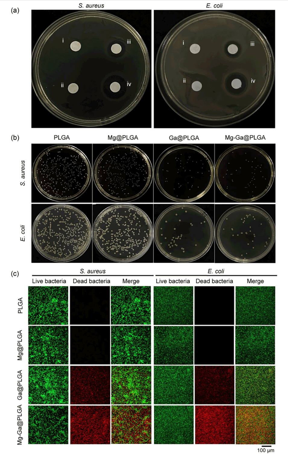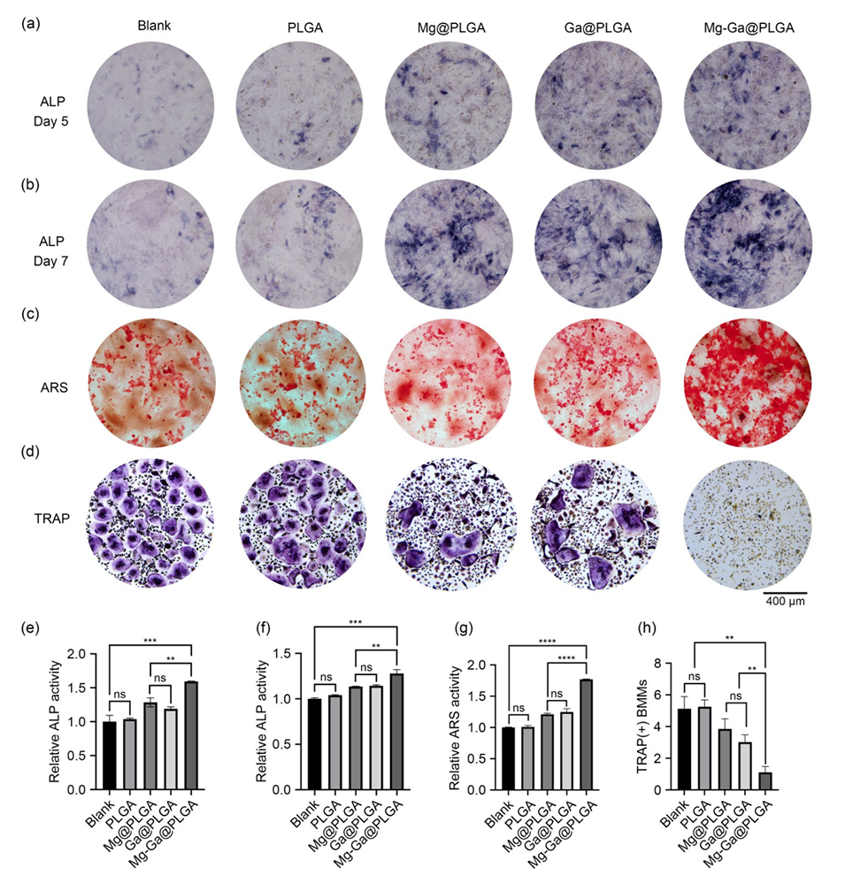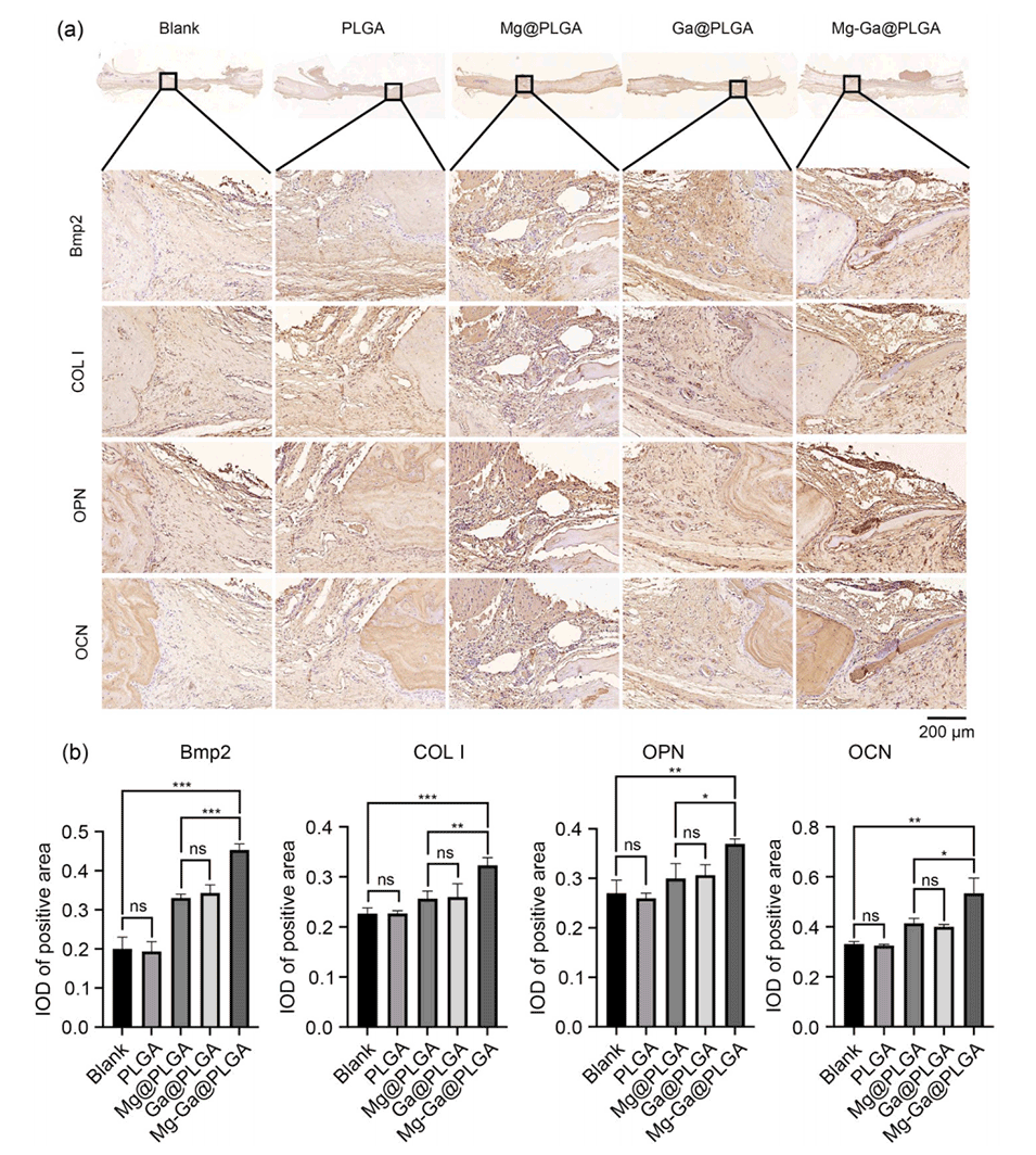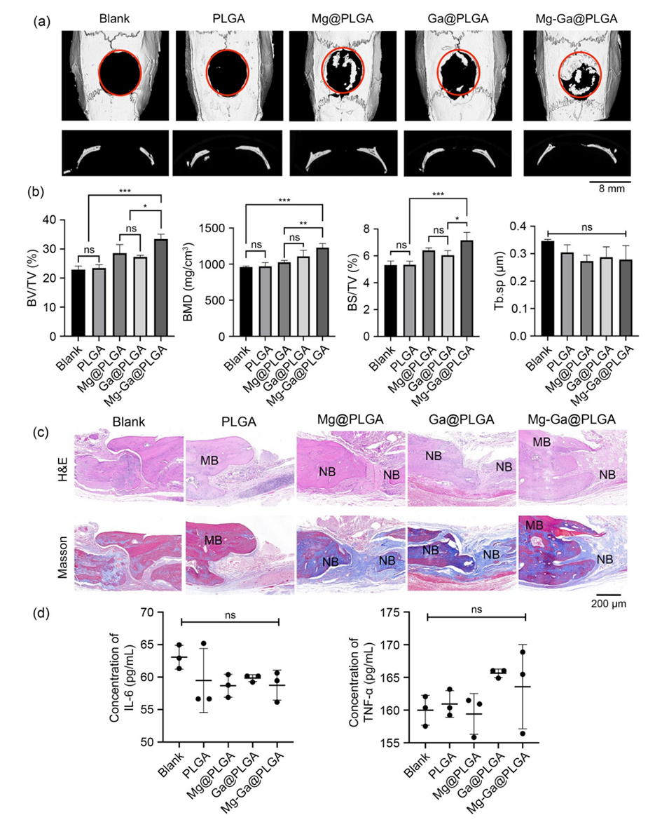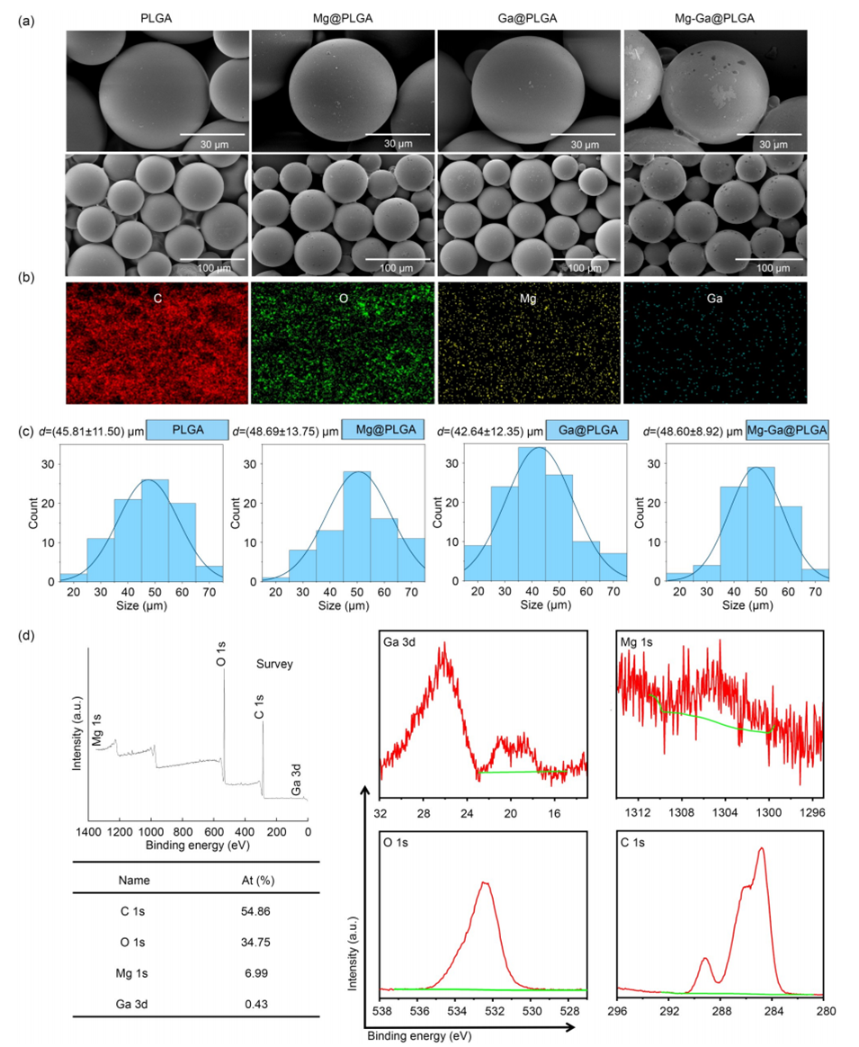 1、本研究制备了镁(Mg2+)和镓(Ga3+)共负载的聚乳酸-羟基乙酸共聚物(PLGA)微球(Mg-Ga@PLGA),可填充不规则骨缺损并显示出良好的生物安全性。