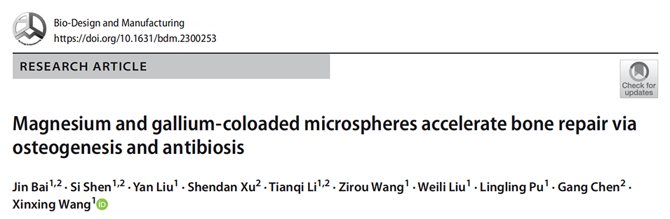 近期,军事科学院军事医学研究院环境医学与作业医学研究所王新兴主任、天津医科大学口腔医院陈刚教授采用改良的水包油包水乳液法制备了镁和镓共负载的PLGA微球,这些微球能有效促进成骨分化、抑制破骨细胞分化,并具有抗菌效果,展现出治疗感染性骨缺损的巨大潜力。相关研究以“Magnesium and gallium-coloaded microspheres accelerate bone repair via osteogenesis and antibiosis”为题目,发表在期刊《Bio-Design and Manufacturing》上。