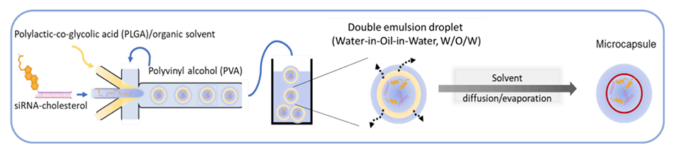 在微流控设备中生成水包油包水(W/O/W)双乳液。内水相:1%(w/v)PVA溶液,含10 mg/mL胆固醇修饰的siRNA或1 mg/mL的10 kDa FITC-葡聚糖。中间油相:2-8%(w/v)PLGA溶解于二甲基碳酸酯(DMC)中。外水相:3%(w/v)PVA溶液。