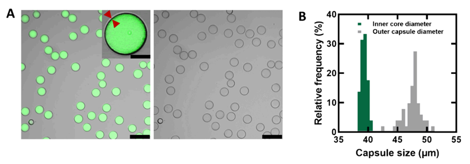 图2.(A)使用CLSM成像的含有10kDa FITC葡聚糖染料的PLGA微胶囊的荧光(绿色,左)和亮场(灰色,右)图像;比例尺,100μm。插图:单个微胶囊的放大图像,红色箭头表示胶囊的外壳;比例尺,20μm。(B)微胶囊直径和内核直径分布的直方图。