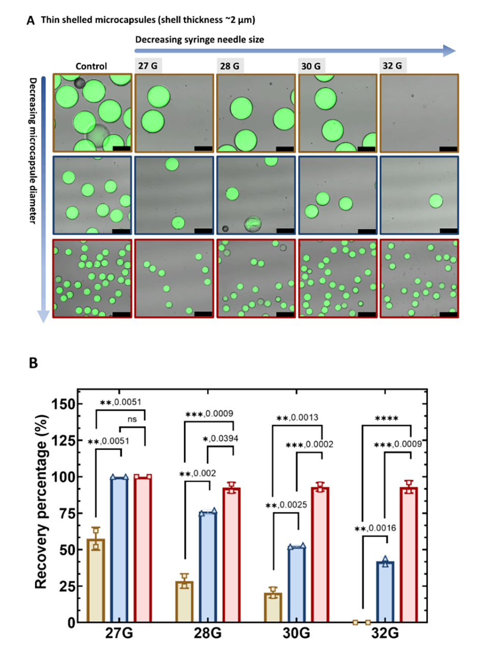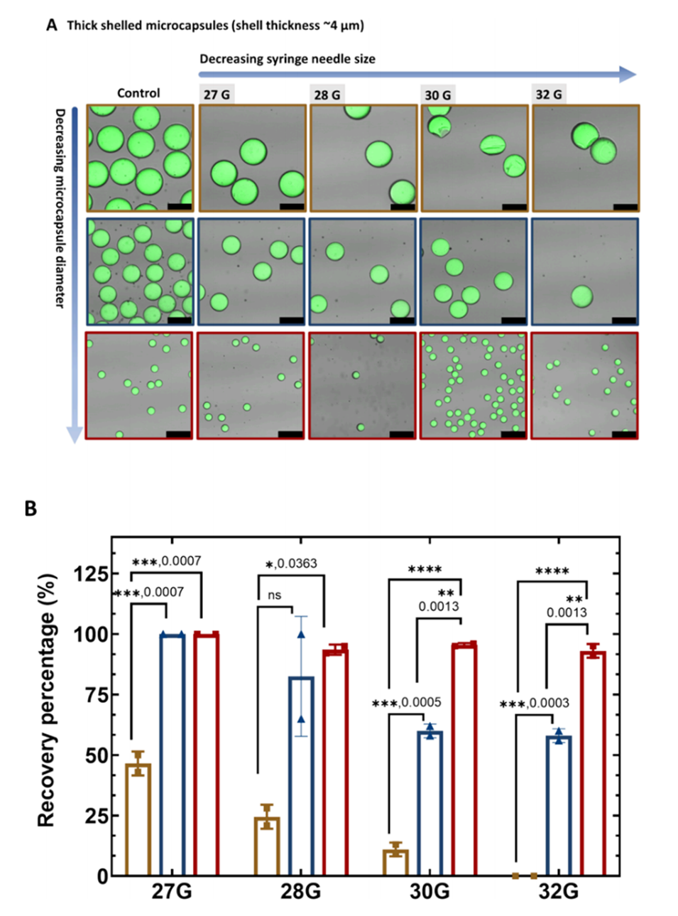 图4.不同尺寸和壳厚的薄壳微胶囊的可注射性。