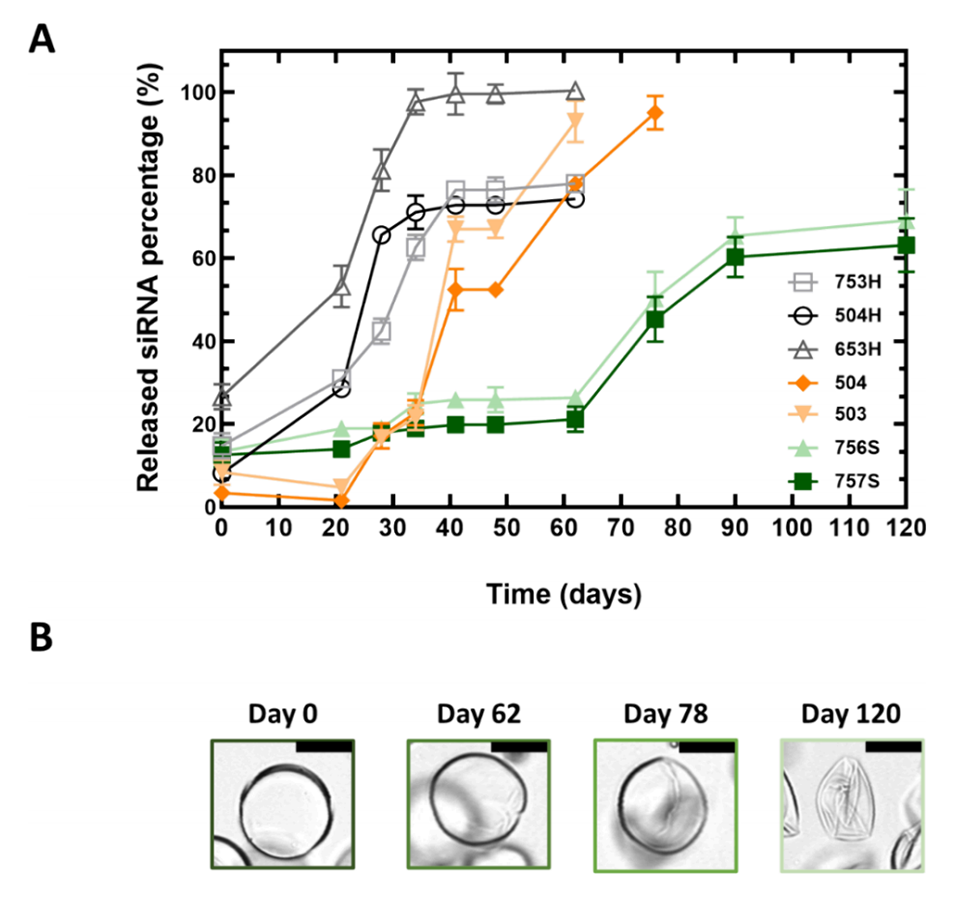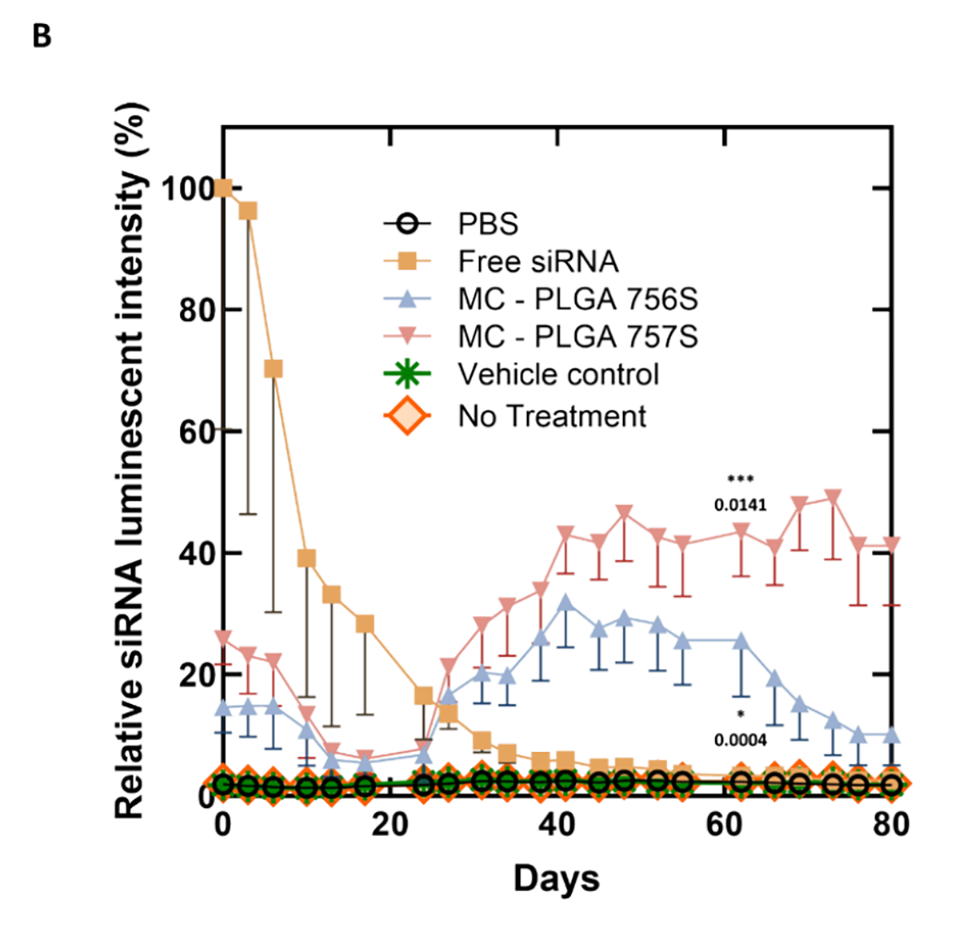 5、结果表明,微胶囊有效保护siRNA免受降解,实现了长达3个月的持续释放,相较于未包封的siRNA显著延长了药效。该方法为siRNA的可控、局部和长效递送提供了新思路。