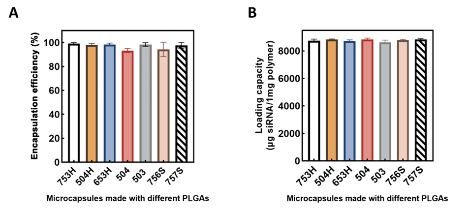 图5.用不同PLGA制成的微胶囊的siRNA包封效率(A)和载量(B)。数据显示为平均值±标准差。