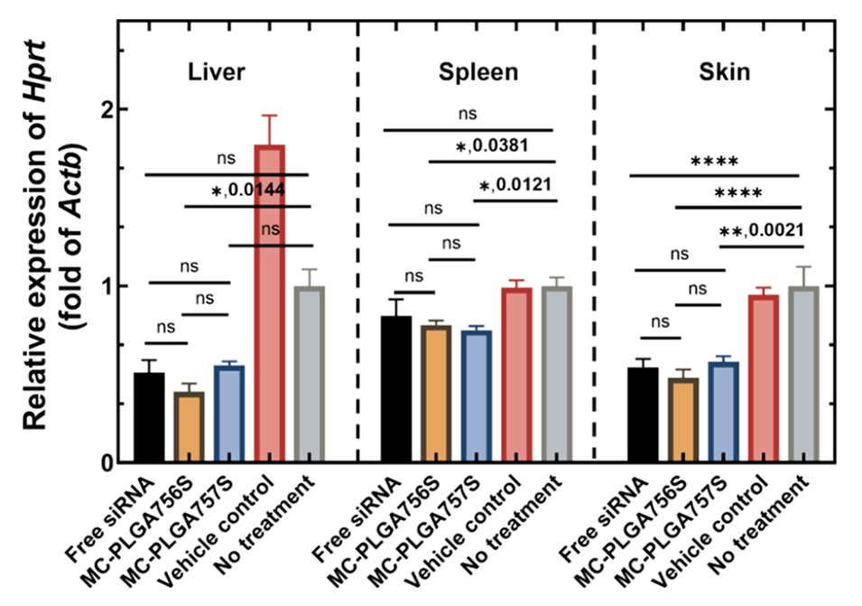 图8.第90天收集的肝脏、脾脏和皮肤组织中Hprt的相对基因表达水平,以相对于Actb的表达倍数表示。每个柱状图表示几何平均值±标准误差,以表达倍数形式呈现。统计分析方法为单因素方差分析,并使用Tukey事后检验进行多重比较(α=0.05),6次生物学重复,****p<0.0001;***p<0.001;**p<0.01;*p<0.05;ns:无显著差异。