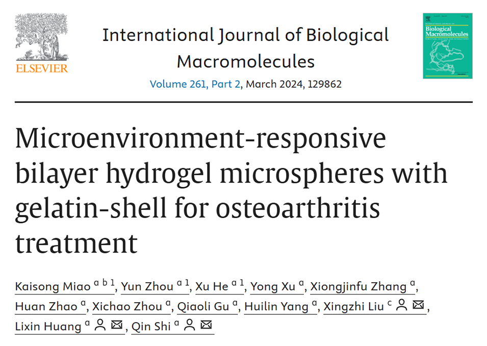 近期,苏州大学第一附属医院骨科施勤教授、黄立新副教授和中国科学院苏州纳米技术与纳米仿生研究所刘星志等人通过微流控技术制备了一种微环境响应型双层水凝胶微球,其外层甲基丙烯酰化明胶(GelMA)壳可快速响应骨关节炎微环境释放抗炎药物塞来昔布(CLX),内层甲基丙烯酰化硫酸软骨素(ChsMA)核逐步释放软骨素,协同实现抗炎和软骨修复,为骨关节炎治疗提供了一种新型高效策略。相关研究以“Microenvironment-responsive bilayer hydrogel microspheres with gelatin-shell for osteoarthritis treatment”为题目,发表在期刊《International Journal of Biological Macromolecules》上。