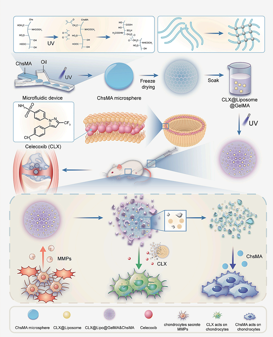 Scheme 1.ChsMA+CLX@Lipo@GelMA双层微球的制备示意图及其在关节内注射后的作用机制。外层(GelMA)响应骨关节炎微环境中的MMPs而快速降解,释放出负载CLX的脂质体。释放的CLX具有抗炎作用,含有ChsMA的内核结构暴露并开始降解,促进经历退行性损伤的OA软骨的修复。