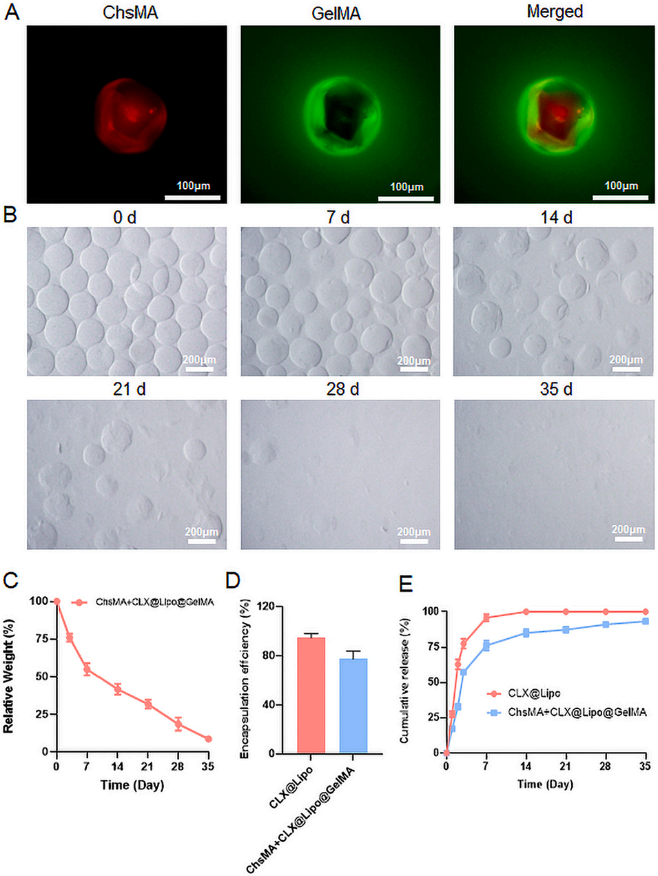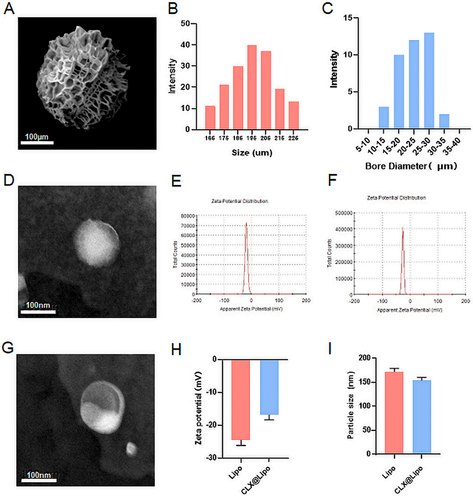 图2.ChsMA+CLX@Lipo@GelMA双层微球的表征。