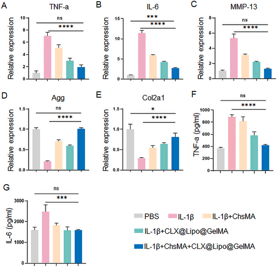 图4.ChsMA+CLX@Lipo@GelMA双层微球可减轻IL-1β诱导的炎症,促进软骨合成代谢,抑制分解代谢。