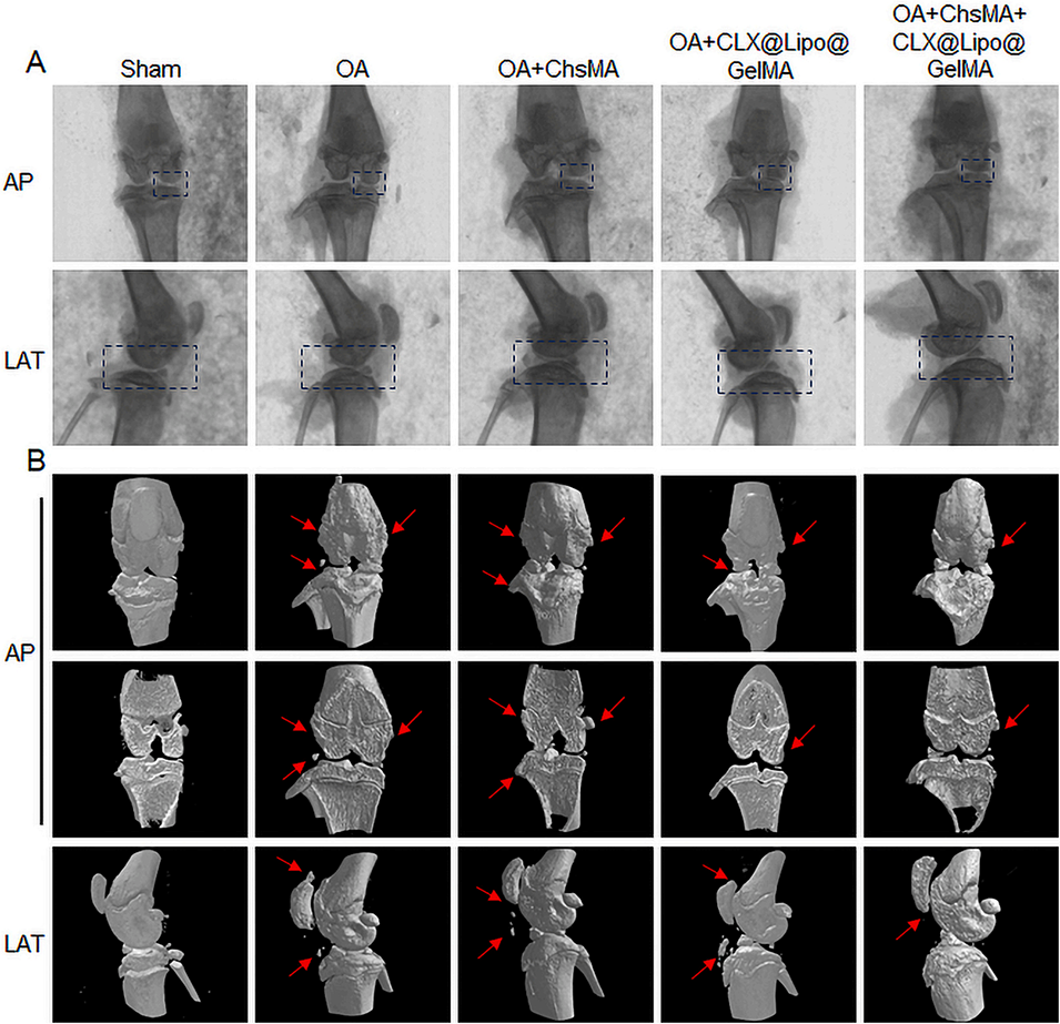 图5.ChsMA+CLX@Lipo@GelMA双层微球可减少关节间隙狭窄和骨赘形成。