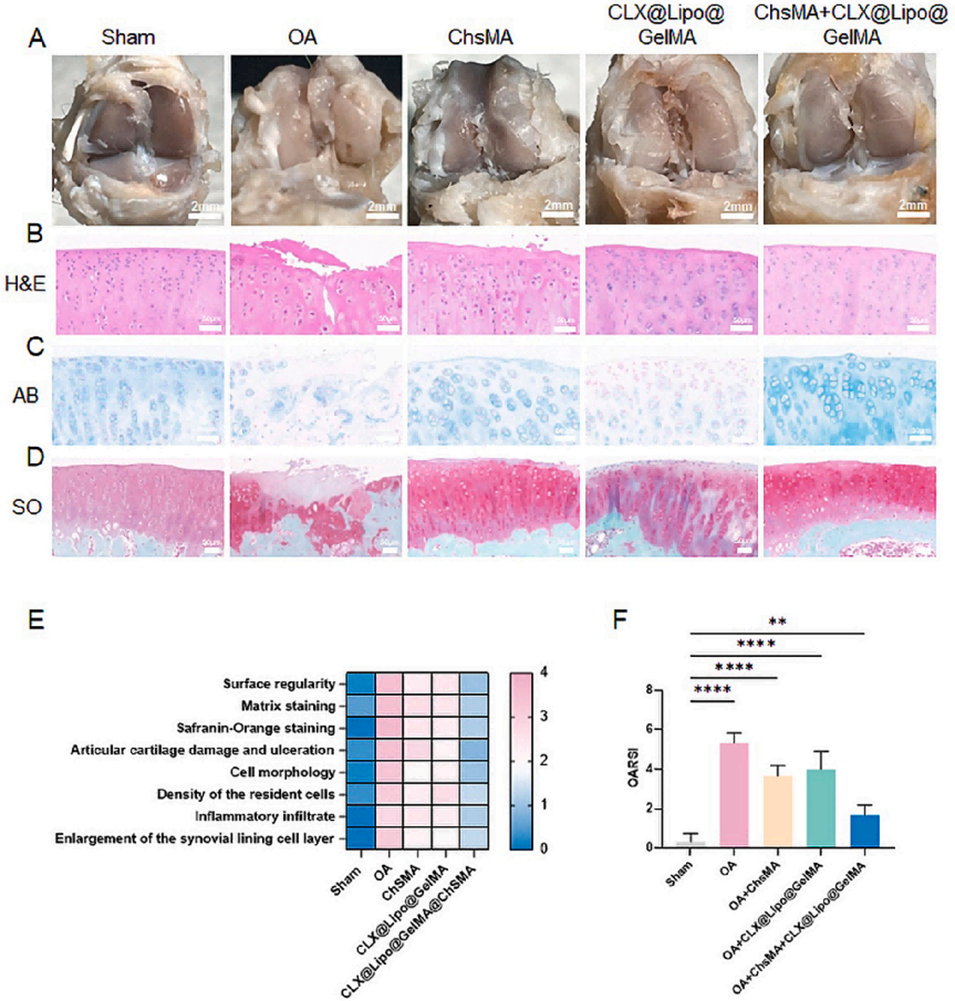 图6.ChsMA+CLX@Lipo@GelMA双层微球对术后8周大鼠OA软骨退变的修复作用。