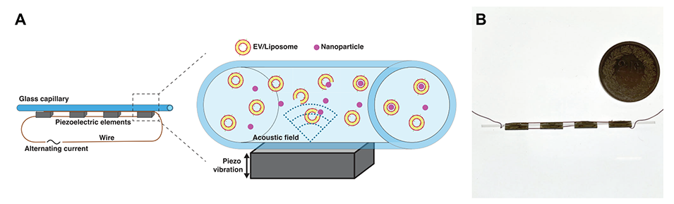 图1.A)μSonicator的图示。将规定频率的交流电施加到压电装置上,使其振动并在毛细管内产生声场,从而形成囊泡-NP杂化物。B)μSonicator的图像。参照为直径27.40毫米的硬币。