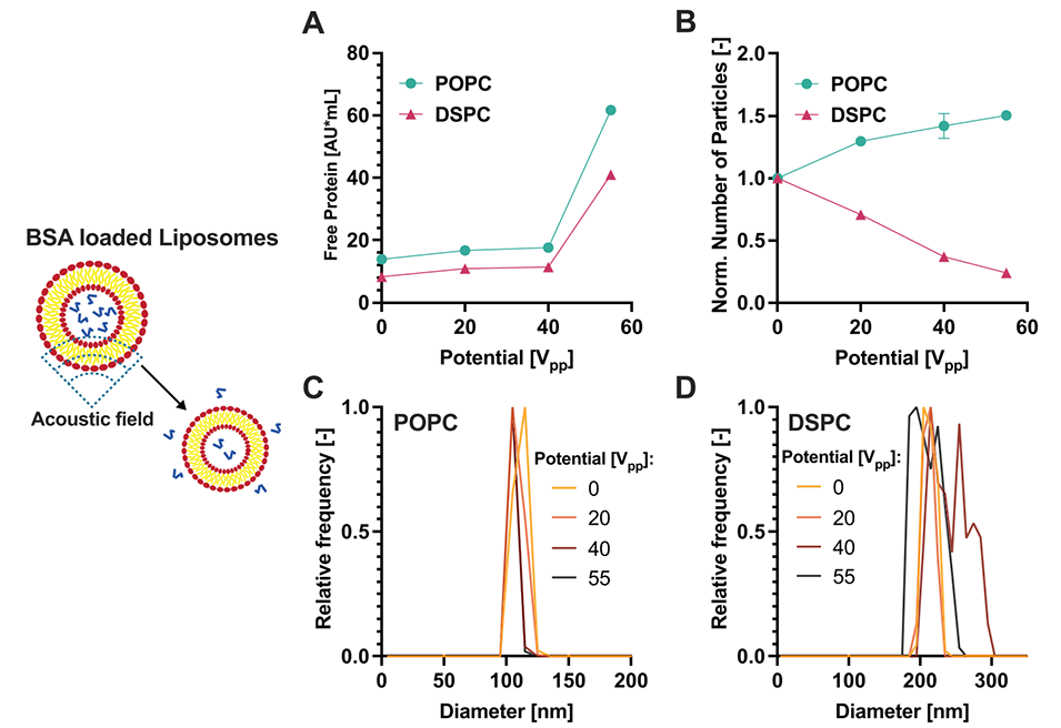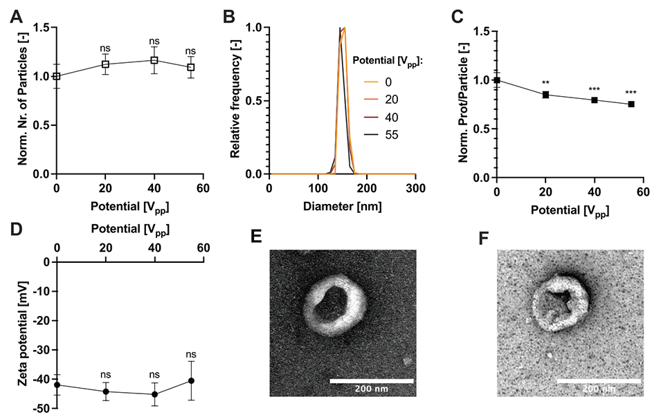 μSonicator由多个压电元件组成,这些元件被粘合到一个圆形玻璃毛细管上。当施加交变电压时,压电元件振动,从而在毛细管内产生声场。声场的作用使得囊泡膜部分打开,释放囊泡内的内容物(如蛋白质),为纳米颗粒的包覆创造条件。