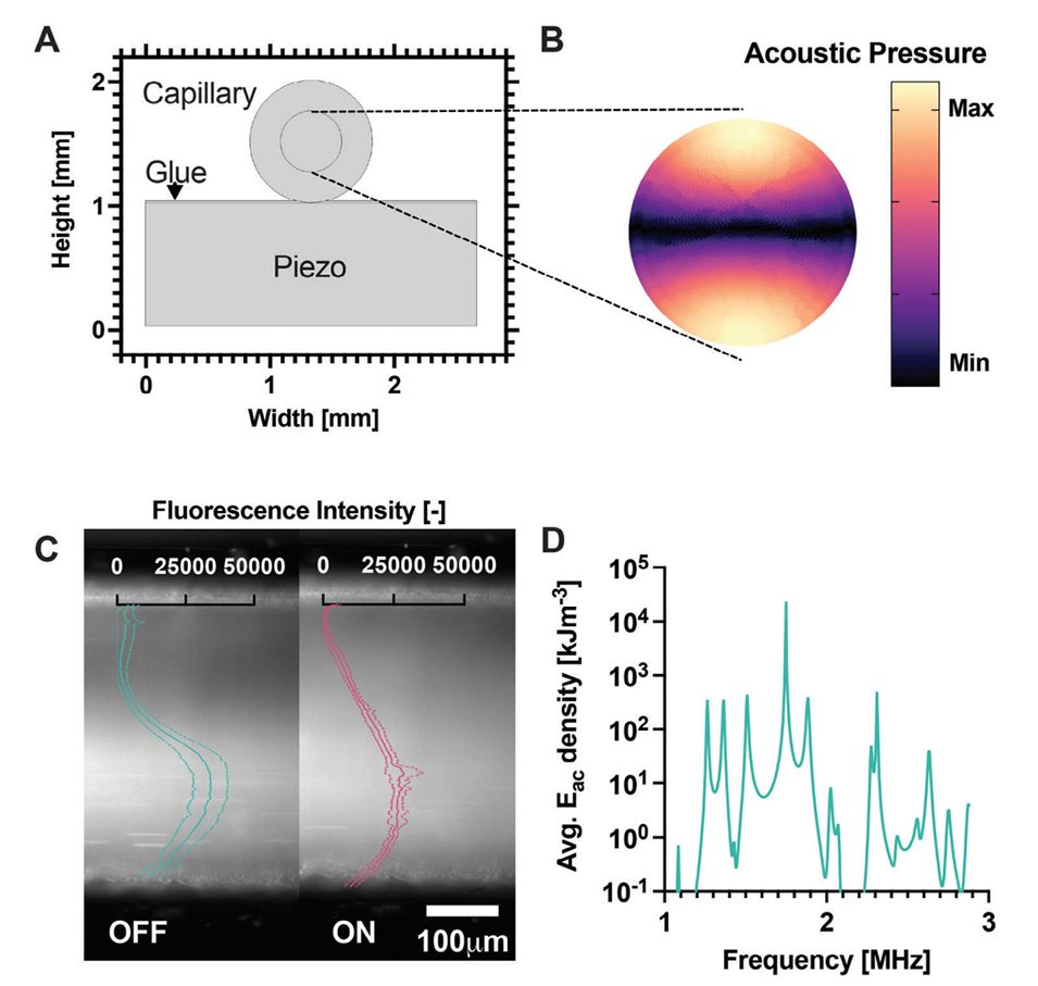 图2.A)μSonicator横截面模型。B)在1.75MHz激励频率下模拟玻璃毛细管横截面中的声压分布。C)在声场关闭和打开的情况下,100nm聚苯乙烯颗粒在微流体通道中的分布。由于声场的作用,颗粒在毛细管中迁移。通道中的叠加-荧光强度分布。最低值已标准化为0。虚线表示三次重复的标准偏差。D)模拟不同激励频率下的平均声能密度(Eac)。