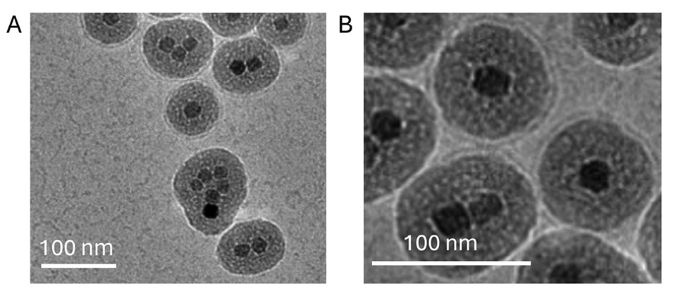 图5.由声学微流体装置产生的脂质双层包覆核壳氧化铁纳米颗粒组成的杂化物的低温EM图像。
