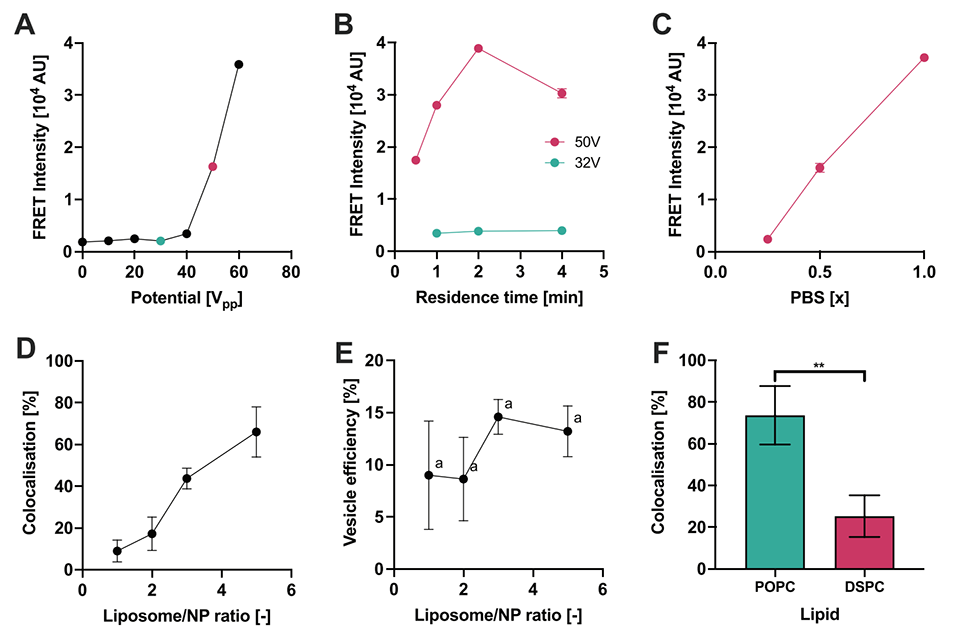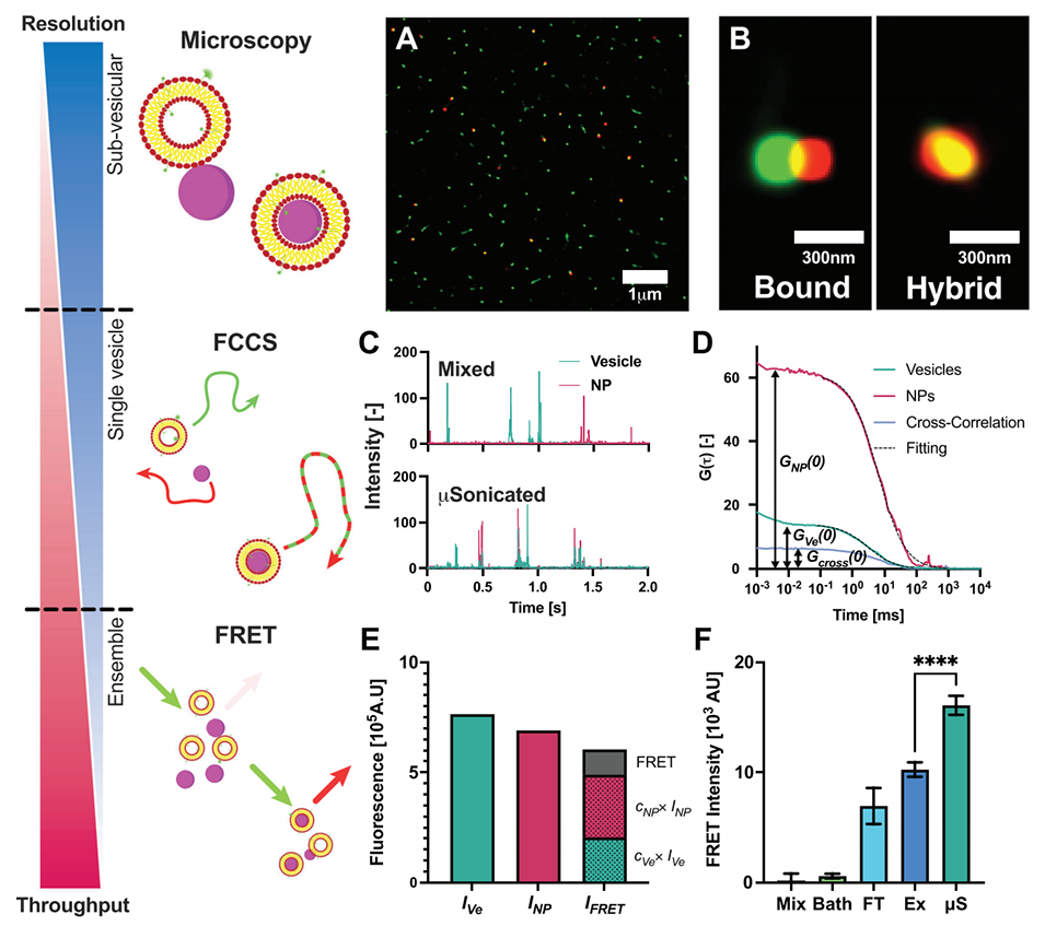 1、本研究开发了一种声学微流体装置(μSonicator)和分析平台,用于制备纳米颗粒-囊泡杂化物,并通过多种基于荧光的技术(FRET、FCCS和超分辨显微镜)定量表征其覆盖率。