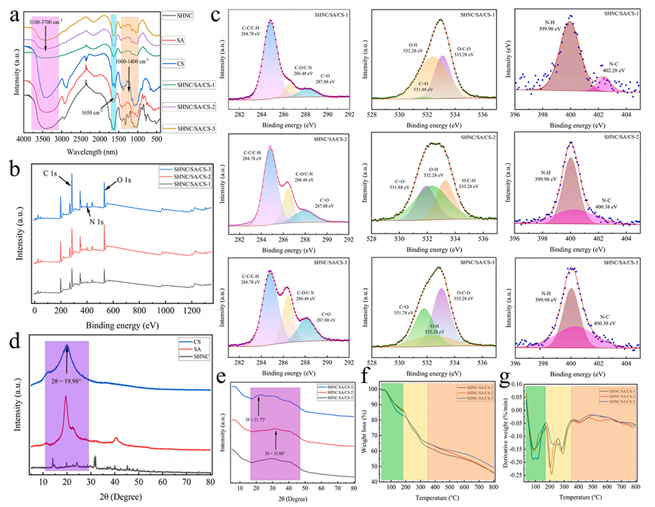 2、SHNC/SA/CS水凝胶微球具有优异的韧性(18.67 MPa)和亲水性(接触角21.43°±0.65°),提升了再利用率,且富含羟基、羧基和氨基等螯合基团,显著提高了吸附效率。
