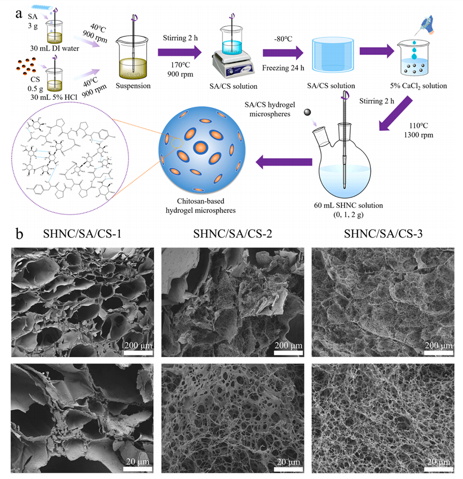 图1.(a)壳聚糖基水凝胶微球的制备工艺及形成机理。(b)壳聚糖基水凝胶微球的微观结构。
