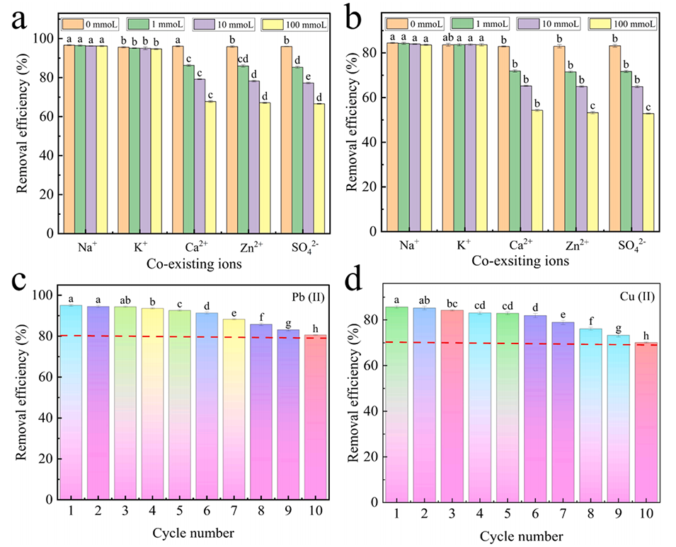 图6.共存阳离子和吸附-解吸循环对Pb(II)和Cu(II)吸附的影响。