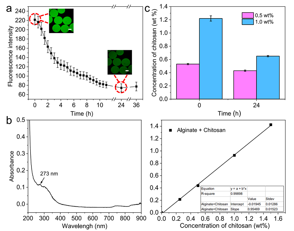 图2.AC-Ca水凝胶微球内荧光强度(a)和壳聚糖浓度(c)的测量,壳聚糖的全波长紫外扫描光谱图及其在273nm处的线性回归(b)。