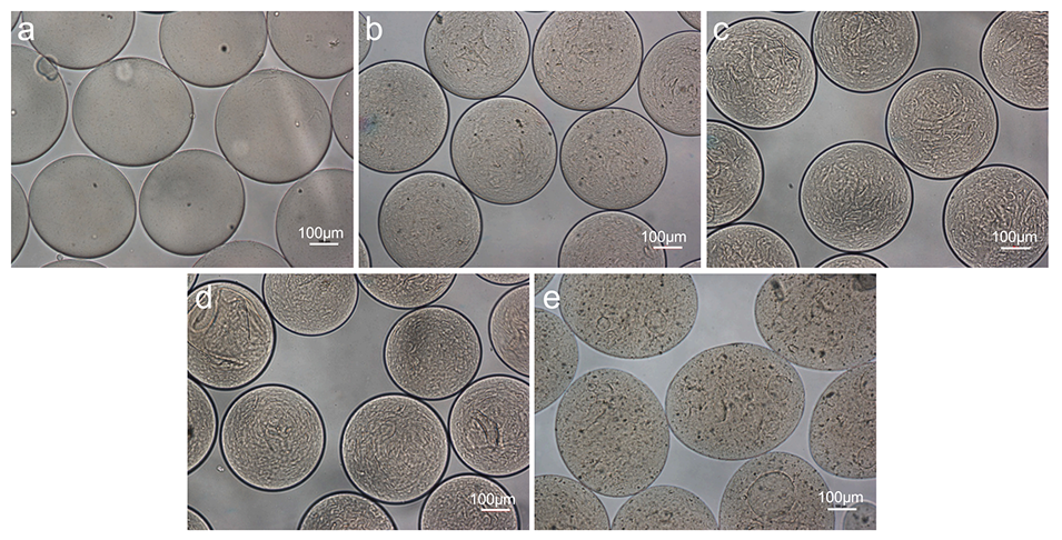 图1.不同壳聚糖浓度制备的AC-Ca水凝胶微球的光学图像:(a)0;(b)0.75wt%;(c)1.0wt%;(d)1.5wt%;(e)2.0wt%。