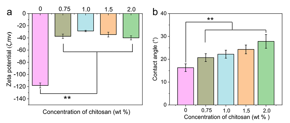 图4.不同壳聚糖浓度制备的水凝胶的ζ电位(a)和接触角(b)(*p<0.05,**p<0.01)。