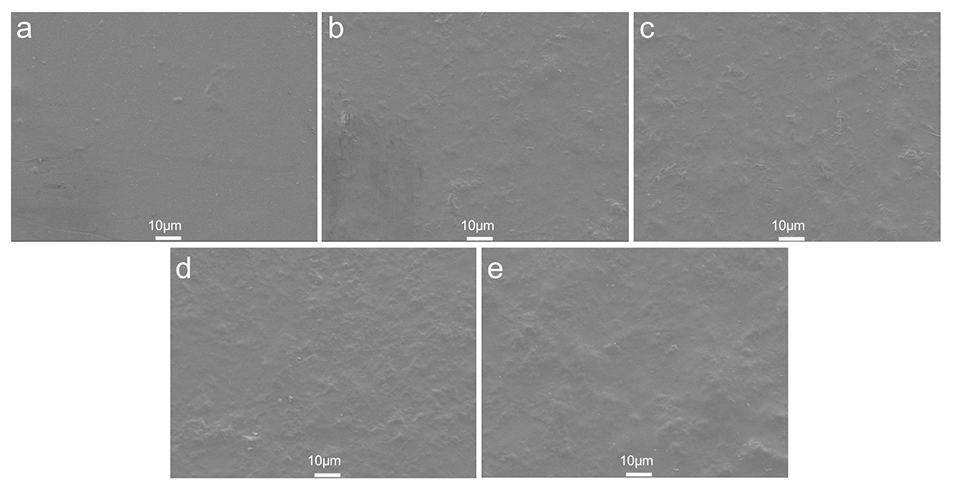 图3.不同壳聚糖浓度制备的AC-Ca水凝胶膜的SEM图像:(a)0;(b)0.75wt%;(c)1.0wt%;(d)1.5wt%;(e)2.0wt%。