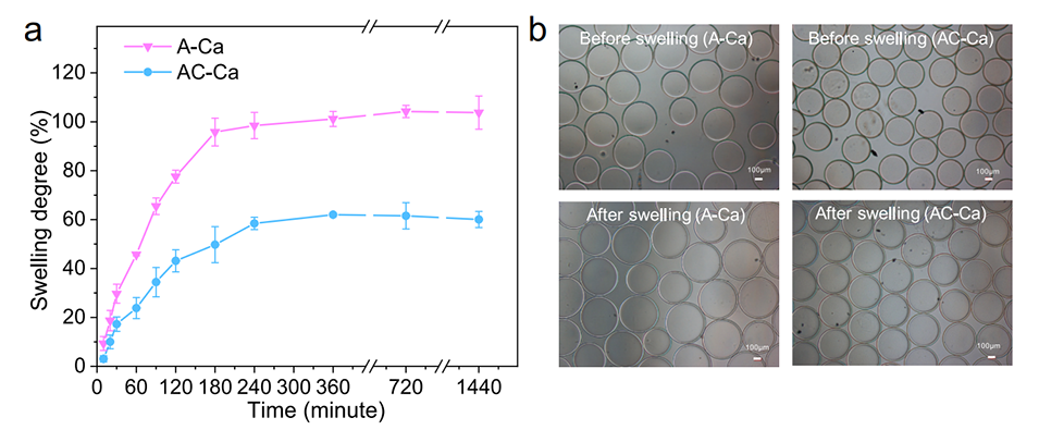 图5.A-Ca和AC-Ca水凝胶微球的溶胀度(a)和相差显微照片(b)。