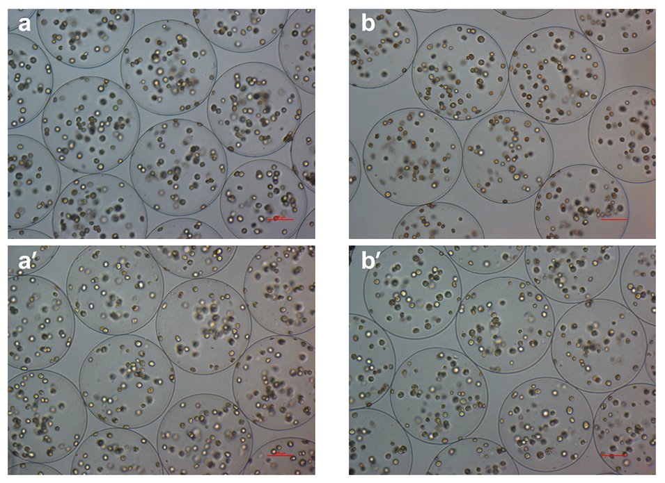 图6.包埋在A-Ca(a:0天,b:7天)和AC-Ca水凝胶微球(a':0天,b':7天)中的肝细胞的相差显微照片,比例尺=100μm。