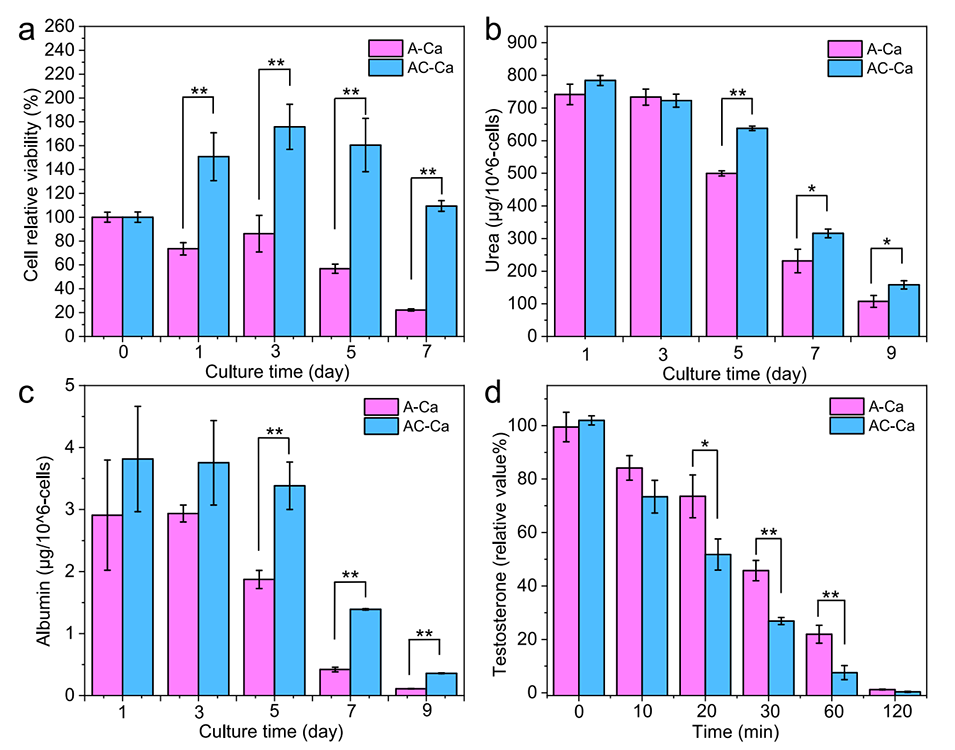 图7.不同培养时间下A-Ca、AC-Ca水凝胶微球中肝细胞的活力和代谢评估。(a)存活率;(b)尿素合成,(c)白蛋白分泌和(d)细胞色素P450活性(CYP2C11)(*P<0.05,**P<0.01)。