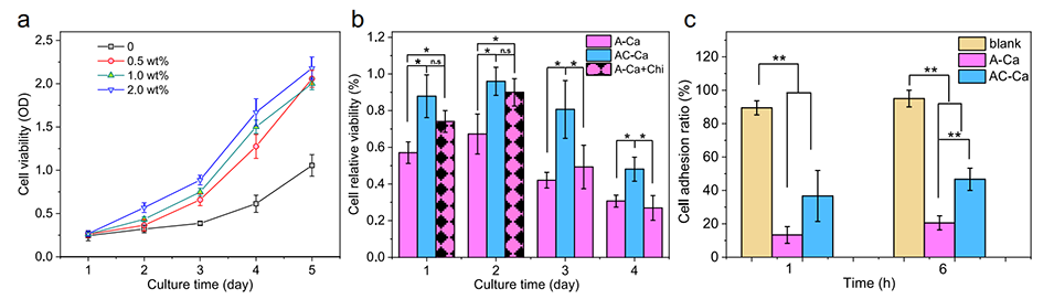 图8.用不同浓度的壳聚糖培养的C3A细胞的相对存活率(a);壳聚糖对肝细胞存活率的影响;肝细胞粘附在空白、A-Ca、AC-Ca制备的水凝胶膜上(**P<0.01,*P<0.05,n.s:无显著性)。