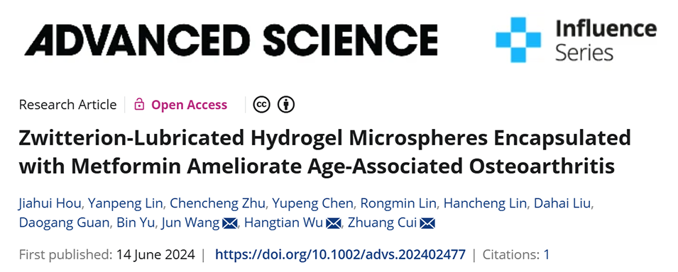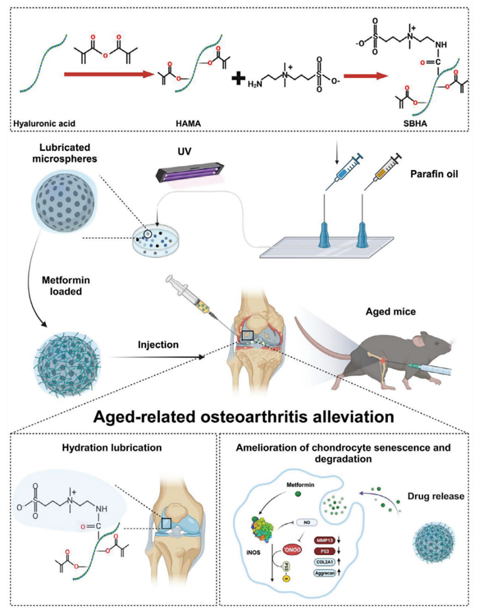 软骨细胞衰老和润滑减少在年龄相关性骨关节炎(OA)的发病机制中发挥着关键作用。近期,南方医科大学南方医院崔壮教授、吴航天博士和佛山大学汪军副教授等人通过微流控技术合成了一种高润滑性和高药物负载的水凝胶微球,以改善与年龄相关的骨关节炎(OA)。相关研究以“Zwitterion-Lubricated Hydrogel Microspheres Encapsulated with Metformin Ameliorate Age-Associated Osteoarthritis”为题目,发表在期刊《Advanced Science》上。