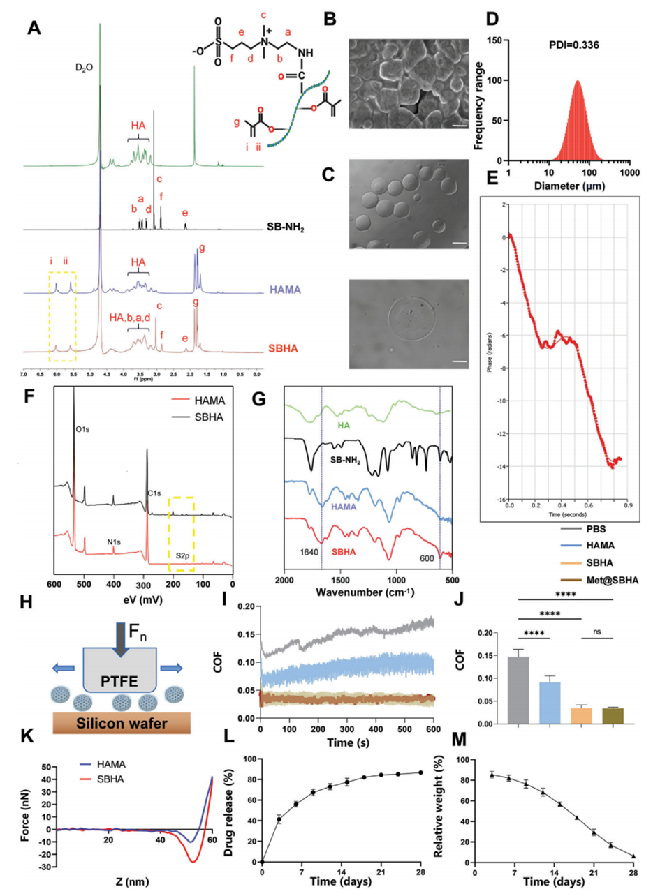 1、在本研究中,利用微流体技术通过磺基甜菜碱(SB)改性透明质酸甲基丙烯酸酯的自由基聚合,设计并制备了高度润滑和载药的水凝胶微球(Met@SBHA)。