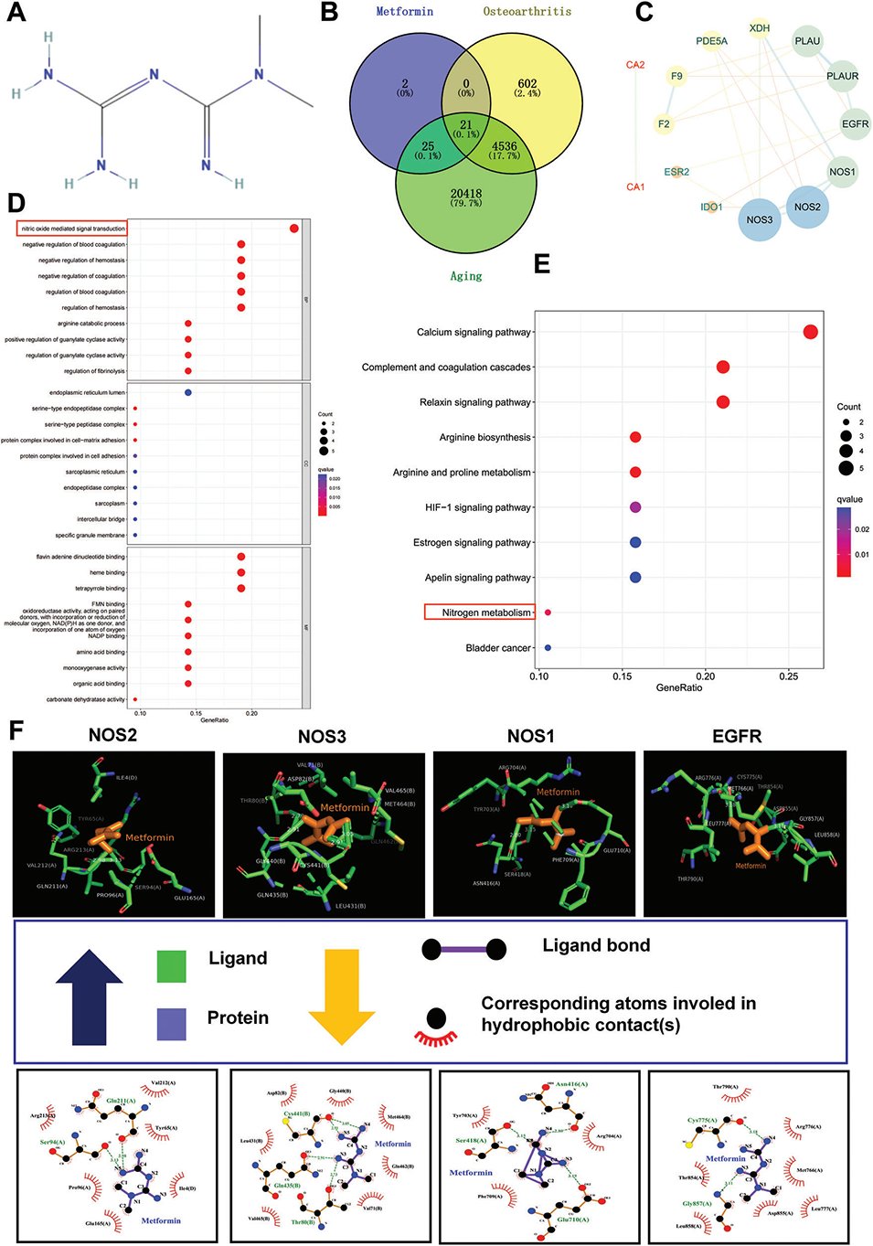 图6.网络药理学分析和分子对接揭示NOS2(iNOS)是Met调控衰老的靶基因。