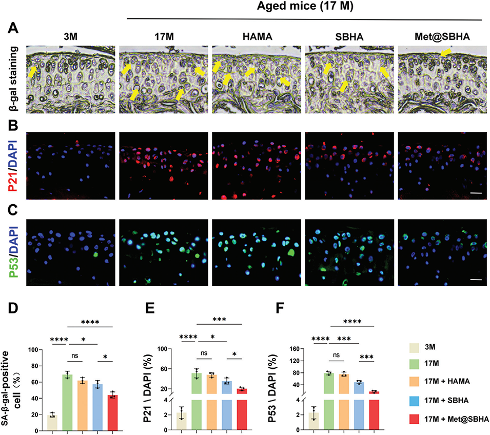 Met@SBHA能够显著降低与衰老相关的炎症因子(如IL-1β和IL-6)的表达,从而减轻OA的炎症反应,为软骨组织的修复创造有利的环境。