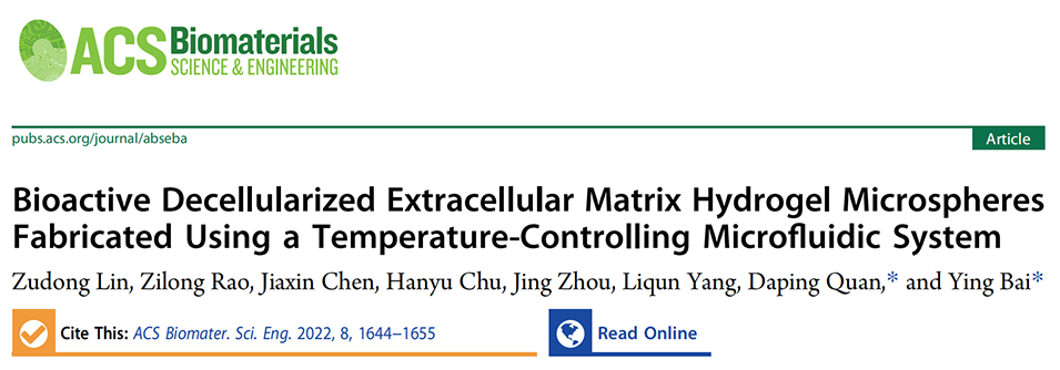 近期,中山大学全大萍教授、白莹副教授团队开发了一种二级温控微流控系统,用于高效制备无化学交联的dECM水凝胶微球,这些微球具有高生物活性和组织特异性,可用于3D细胞培养、细胞移植及再生医学研究。相关研究以“Bioactive Decellularized Extracellular Matrix Hydrogel Microspheres Fabricated Using a Temperature-Controlling Microfluidic System”为题目,发表在期刊《ACS Biomaterials Science & Engineering》上。