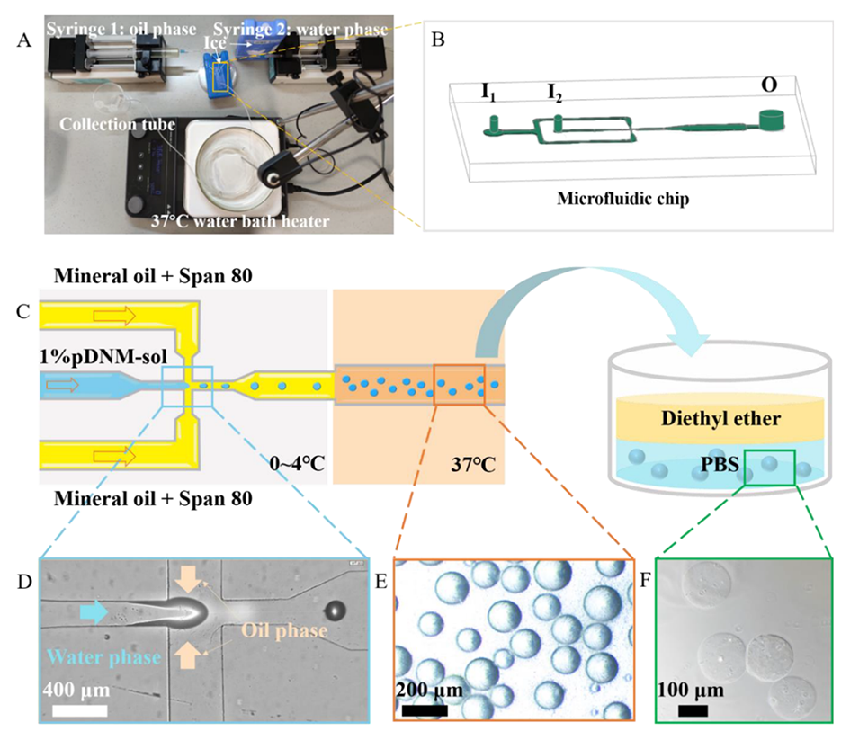 2、水油相混合:水相主要由dECM溶胶(pDNM-sol)组成,油相为含有20%(v/v)Span 80的矿物油。在0~4℃的环境温度下,水相和油相在微流控芯片内混合形成乳液。