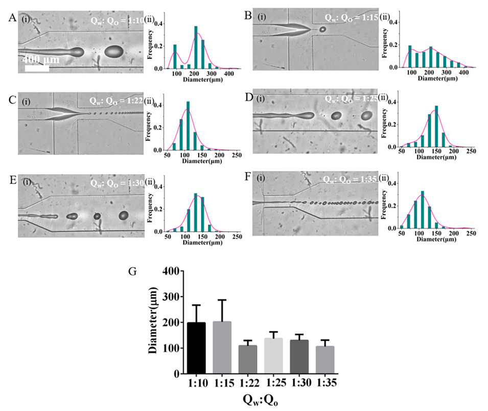 6、尺寸调控:通过调节水相和油相的流速比(例如水相流速为66.7、100、200 μL/h,油相流速为1000、1500、3000、5000、7000 μL/h),可以精确控制微球的尺寸分布。