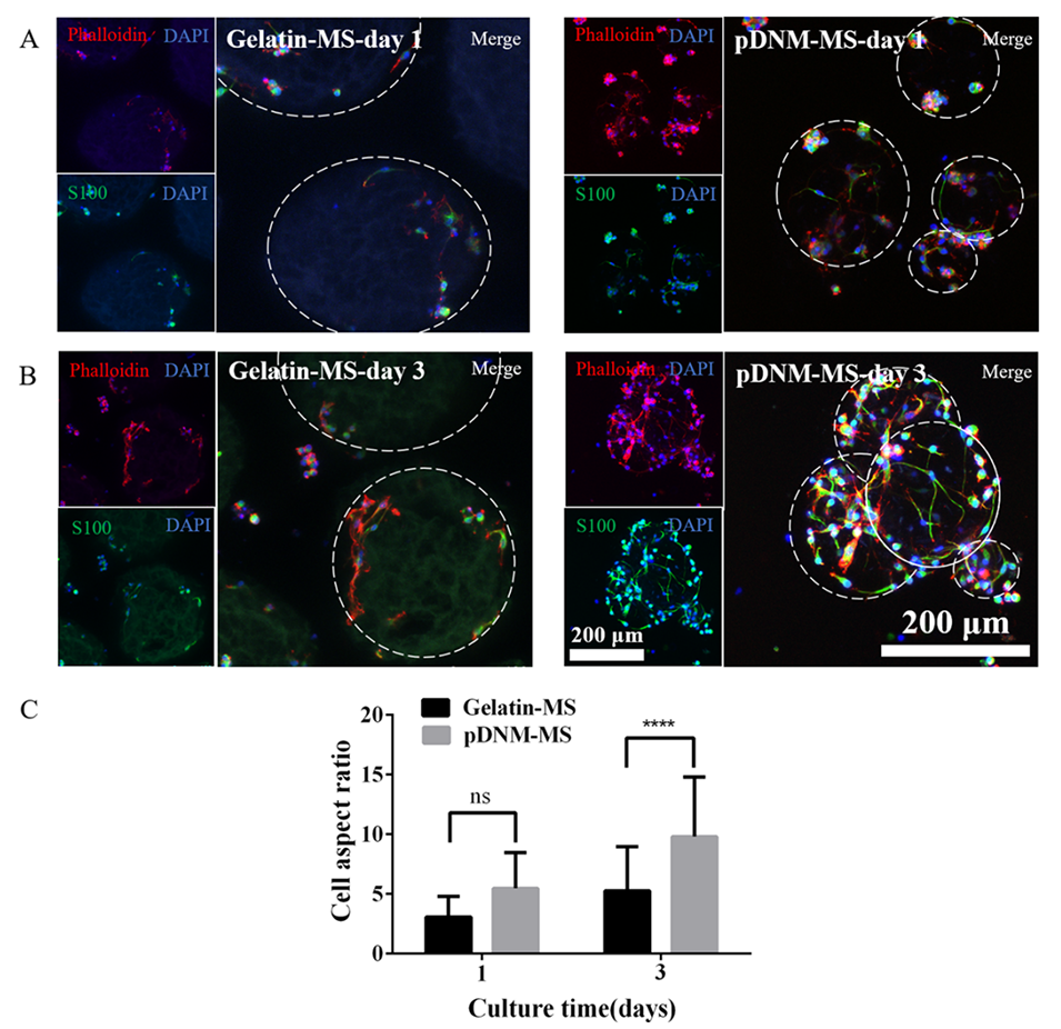 图6.通过荧光共聚焦显微镜对分别在明胶-MSs和pDNM-MSs上培养(A)1天和(B)3天的原代SCs进行免疫荧光染色。SCs用S100(绿色)标记。细胞骨架用鬼笔环肽(红色)标记,细胞核用DAPI(蓝色)标记。(C)明胶-MSs和pDNM-MSs上的SC纵横比。ns,p>0.05,****p<0.0001,n>30。