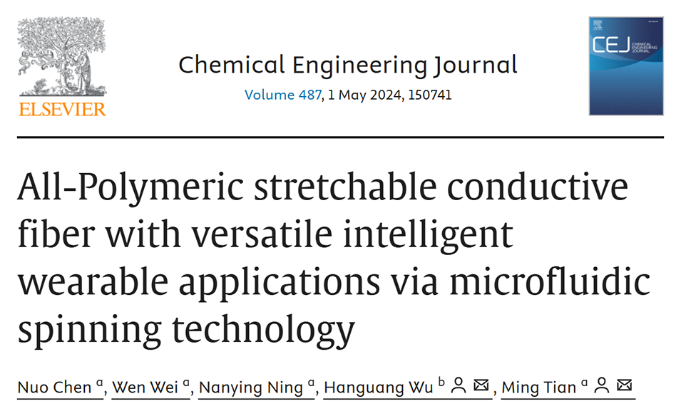 近期,北京化工大学田明教授团队联合北京服装学院吴汉光副教授团队,利用微流控纺丝技术制备了一种核壳结构的全聚合物PU@PEDOT:PSS导电纤维,兼具高导电性(>220 S/m)、高拉伸性(>400%)和优异的机械性能,在智能可穿戴设备领域展现出广泛应用前景。相关研究以“All-Polymeric stretchable conductive fiber with versatile intelligent wearable applications via microfluidic spinning technology”为题目,发表在期刊《Chemical Engineering Journal》上。